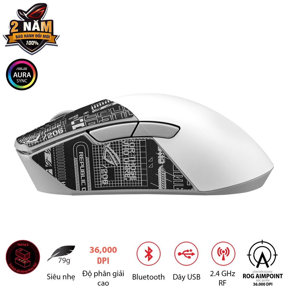 Switch: ROG Micro Switch (70 triệu lần nhấn, mạ vàng) Push-Fit Switch Socket II (hỗ trợ thay switch cơ 3 chân & quang 5 chân)