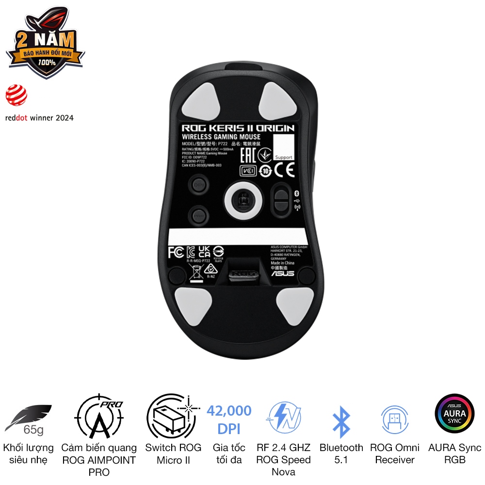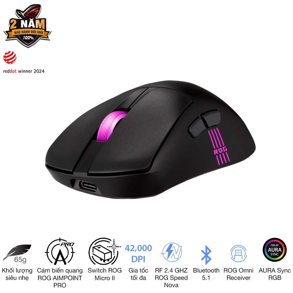 Cảm biến: ROG AimPoint Pro, lên tới 42.000 DPI, hoạt động tốt cả trên bề mặt kính (track-on-glass)